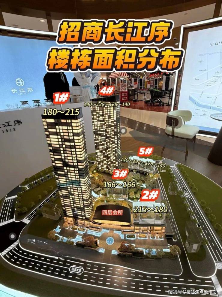 招商长江序占地约2.7万方,总建面约12.15万方,住宅约8.75万方,容积率约3.26,共约560套房源,户均建面约156平。定位纯粹高端改善。共计613个机动车位,车位配比约1:1.09。由5栋超高层组成,其中1、2号楼42层,3号楼45层,4、5号楼44层,1-3号楼为1个单元,4、5号楼为两个单元。总高大概都在42-45F。