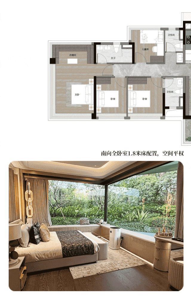 更难得的是,南向所有卧室都能放下1.8米大床+双床头柜。