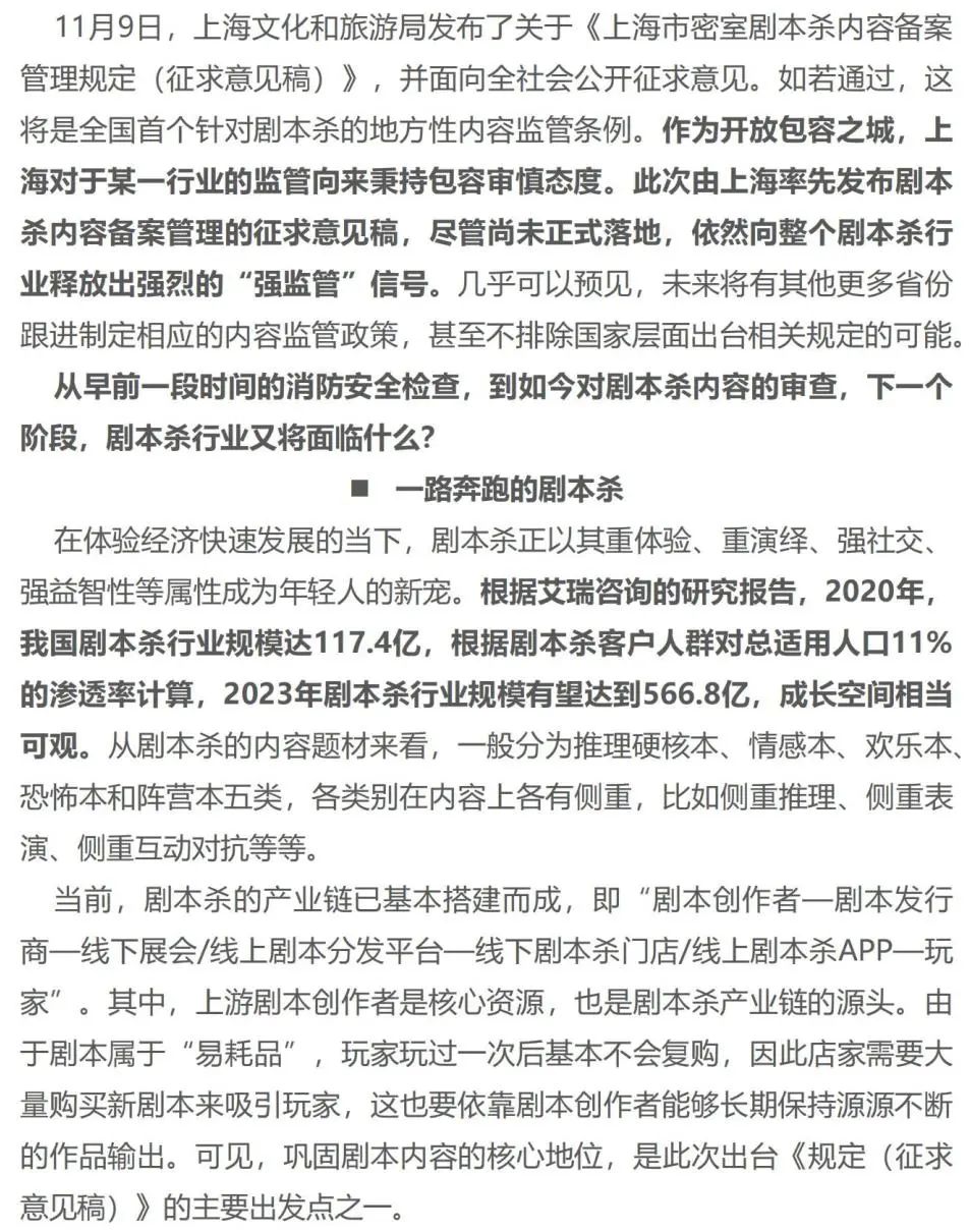 本周,上海文化和旅游局发布了关于《上海市密室剧本杀内容备案管理规定(征求意见稿)》,并面向全社会公开征求意见。如若通过,这将是全国排名前列针对剧本杀的地方性内容监管条例。毫无疑问,剧本杀行业即将迎来“史上最强监管”。