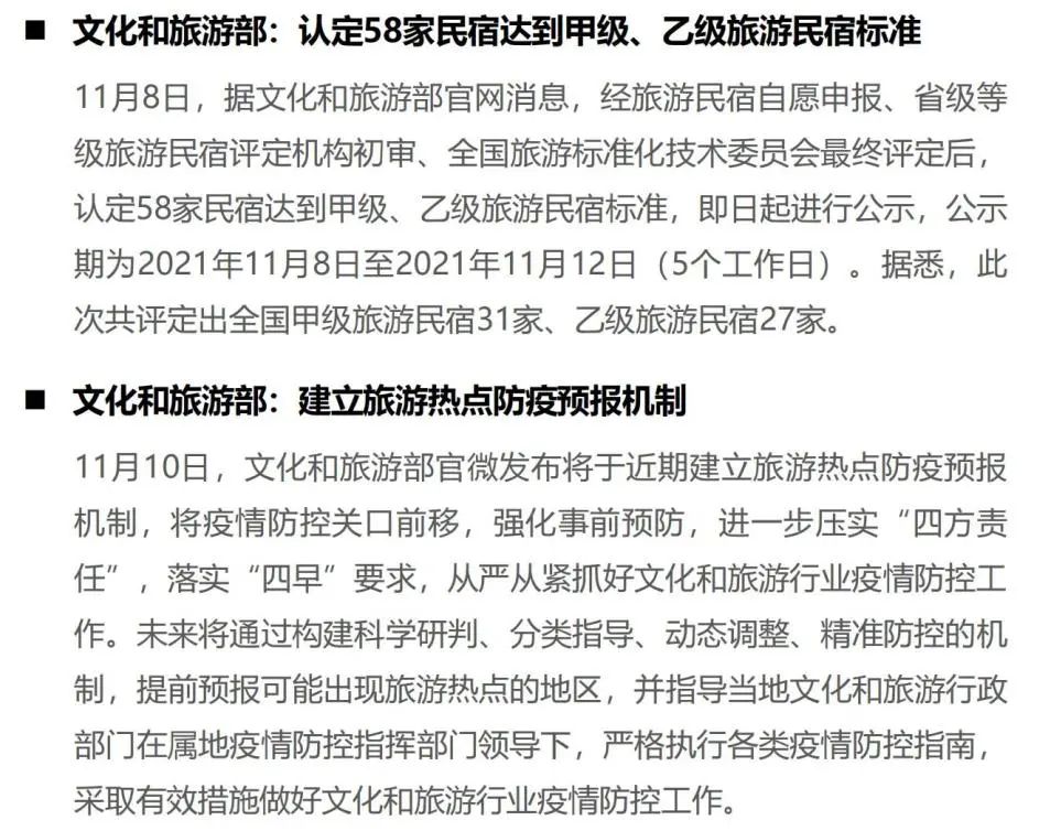 本周,文旅部公示了全国甲级、乙级旅游民宿评定结果。本次共评定甲级旅游民宿31家,北戴河归墟花堂民宿、浙江如隐小佐居民宿等入选;乙级旅游民宿27家,北京石光长城精品民宿、合宿·延庆姚官岭民宿等入选。
