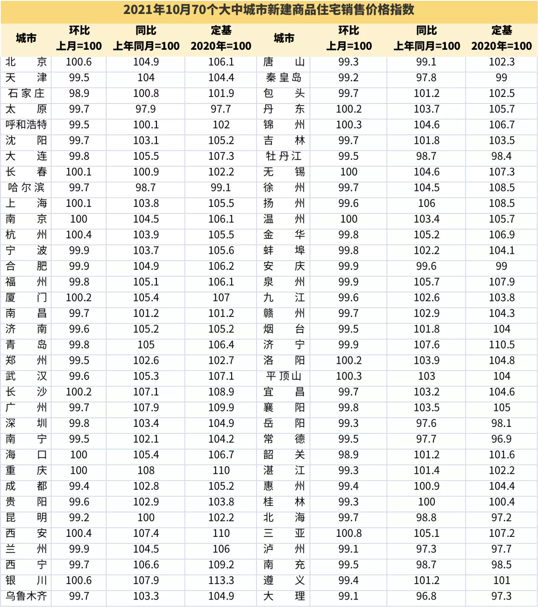 日前,国家统计局较新发布了2021年10月份70个大中城市商品住宅销售价格变动情况。