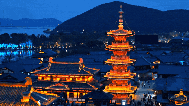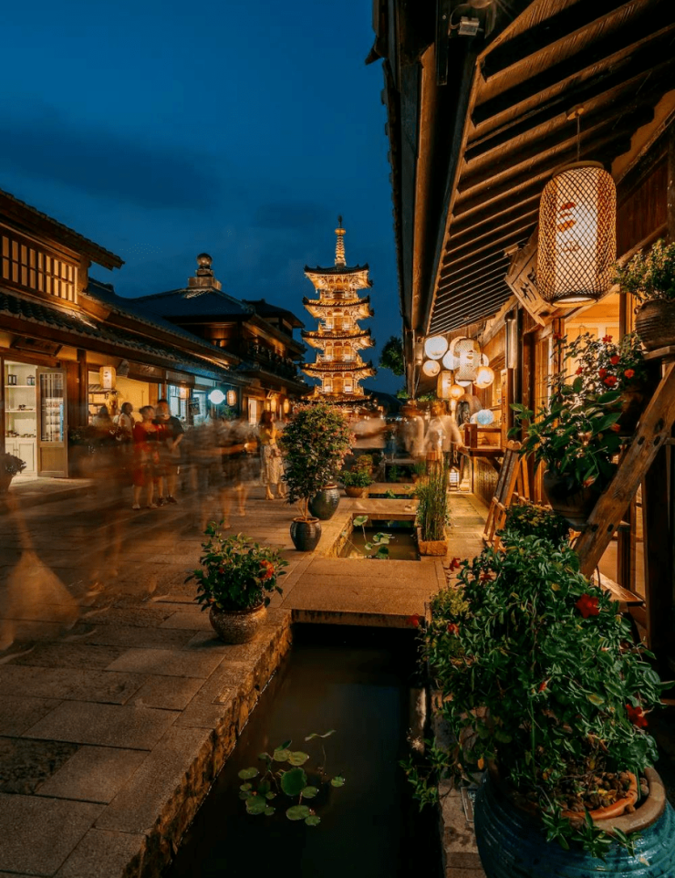 华灯初上,褪去了白天的人来人往,夜幕之下的拈花湾仿佛罩上了一层朦胧的面纱,梦幻无比。