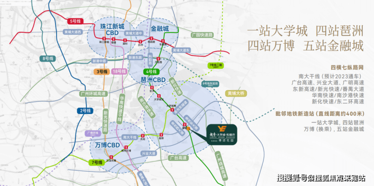 越秀·大学城和樾府地理位置优越,靠近地铁4号线新造站,步行约900米即可到达。通过地铁,四站可达万博、琶洲,五站可到金融城。此外,南大干线和金光东隧道的开通,进一步提升了交通便捷性,使得自驾出行更加方便。