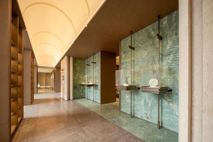 各种石材从门头一路铺进了下沉式庭院,铺进了会所。有一款圣灰米伦石材,这次连供货源都直接被杭序府买空了,可见石材用量之大。