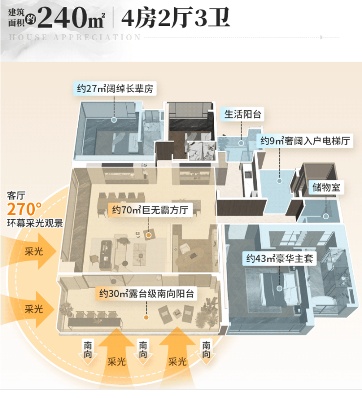 户型设计了双面景观环绕的客厅、总统套房级配置的南向主卧以及全套德系精装厨房。约21米270°云山观景面,将白云山景与城市风光尽收眼底。
