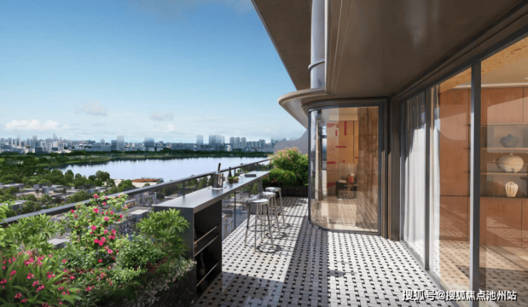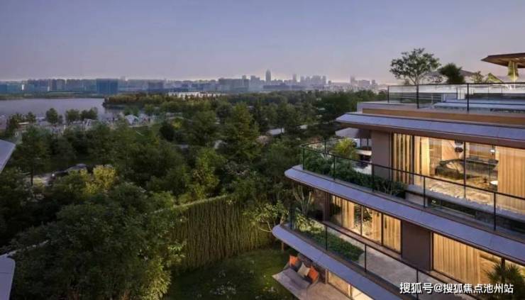超级流体立面系统采用铝板与玻璃幕墙的现代组合,南北分置形成"跑道式"超长露台庭院;超级湖景全景舱概念在建面约400㎡顶复户型中体现得最为极致,通过约6.5米挑空巨厅与三个全部朝湖的露台组合,形成如游艇甲板般的生活体验。