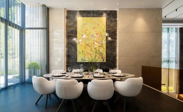 餐厅与会客厅匠心独运的错层设计,与430㎡私家庭院无界衔接,共筑自然与人文交织的诗意天地。