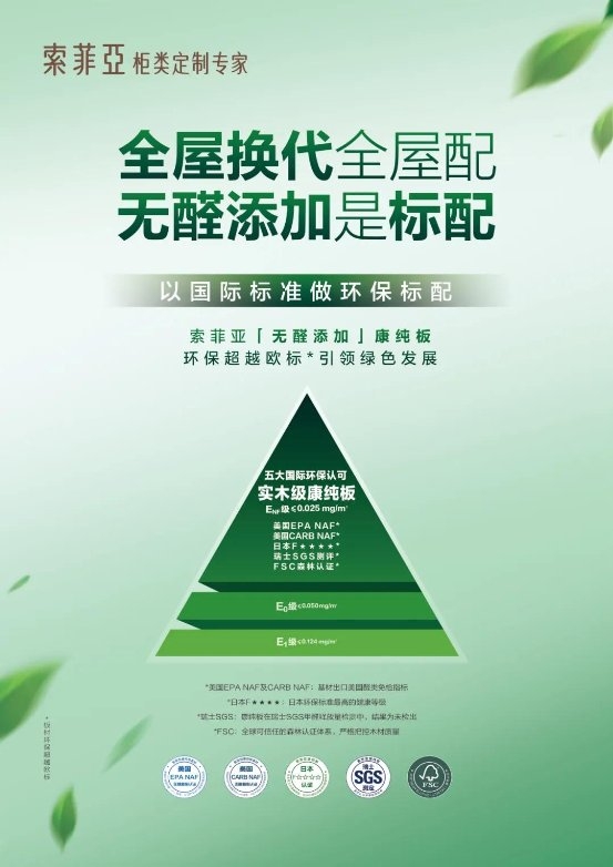 索菲亚一直是健康环保家居领域的推动者和引领者,始终将环保作为家居产品质量的生命线。板材是定制家居使用的核心材料,使用占比高达90%以上,板材的环保性是定制家居除醛的关键,更是家居环保的重阵。2014年,索菲亚推出优于国家标准E1级的企业标准E0板材。2016年,索菲亚全面升级环保板材标准,推出媲美实木的无醛添加康纯板,以推动整个行业板材环保的不断升级。