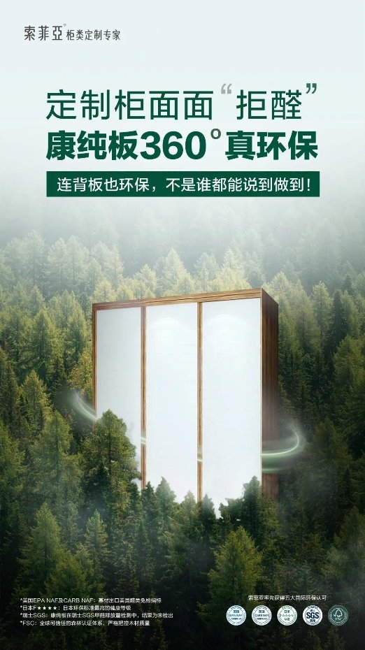 家装过程中,很多消费者更关注门板材料、风格、花色等“外在”因素,忽视很多看不到的产品细节。例如,定制家居产品的背板,通常情况下,它可以占到柜体整体面积的四分之一,而半开放式柜体的背板,则可以占到整柜面积的三分之一,因此,这些看不到的背板环保性可谓至关重要。索菲亚不仅从源头材料上使用了基材无醛添加以及各项物理和化学性能都先进的环保康纯板外,还把产品柜门+四面柜体+背板6面均使用康纯板,做到360度面面拒醛。索菲亚不玩虚的,用用心、细心、良心的产品品质,在消费者看得见和看不见的地方,将无醛环保进行到底。