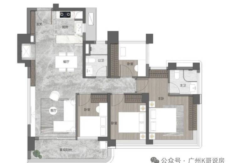 先来看95㎡的户型,南向三房设计,客餐厅和阳台开间去到5.6米,也可改四房,主卧套房设计,带270°大飘窗。