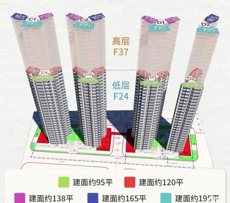 项目规划有4栋37层高层住宅楼,住宅楼都分为高区和低区两部分。