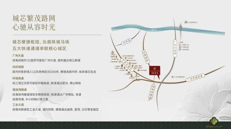 在交通方面,项目位于海珠城心,周围拥有强大的交通网络。毗邻工业大道、南洲路、广州大道等多个重要交通干道,便捷通达全城。