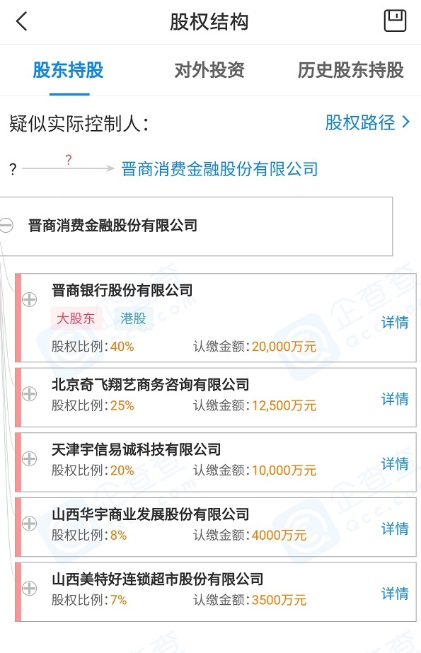 工商信息显示,晋商消费金融股份有限公司大股东为晋商银行,持股比例40%;二股东为北京奇飞翔艺商务咨询有限公司,持股比例为25%,奇飞翔艺的法人代表和董事长是360的董事长周鸿祎,周鸿祎持有奇飞翔艺24.69%的股份。