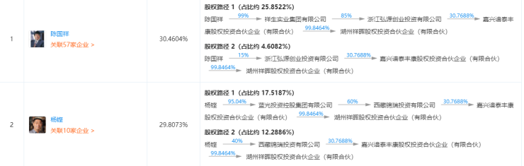 其中,陈国祥通过两种股权路径,持有湖州祥晖股权投资30.4604%;杨铿通过两种股权路径持有29.8073%。