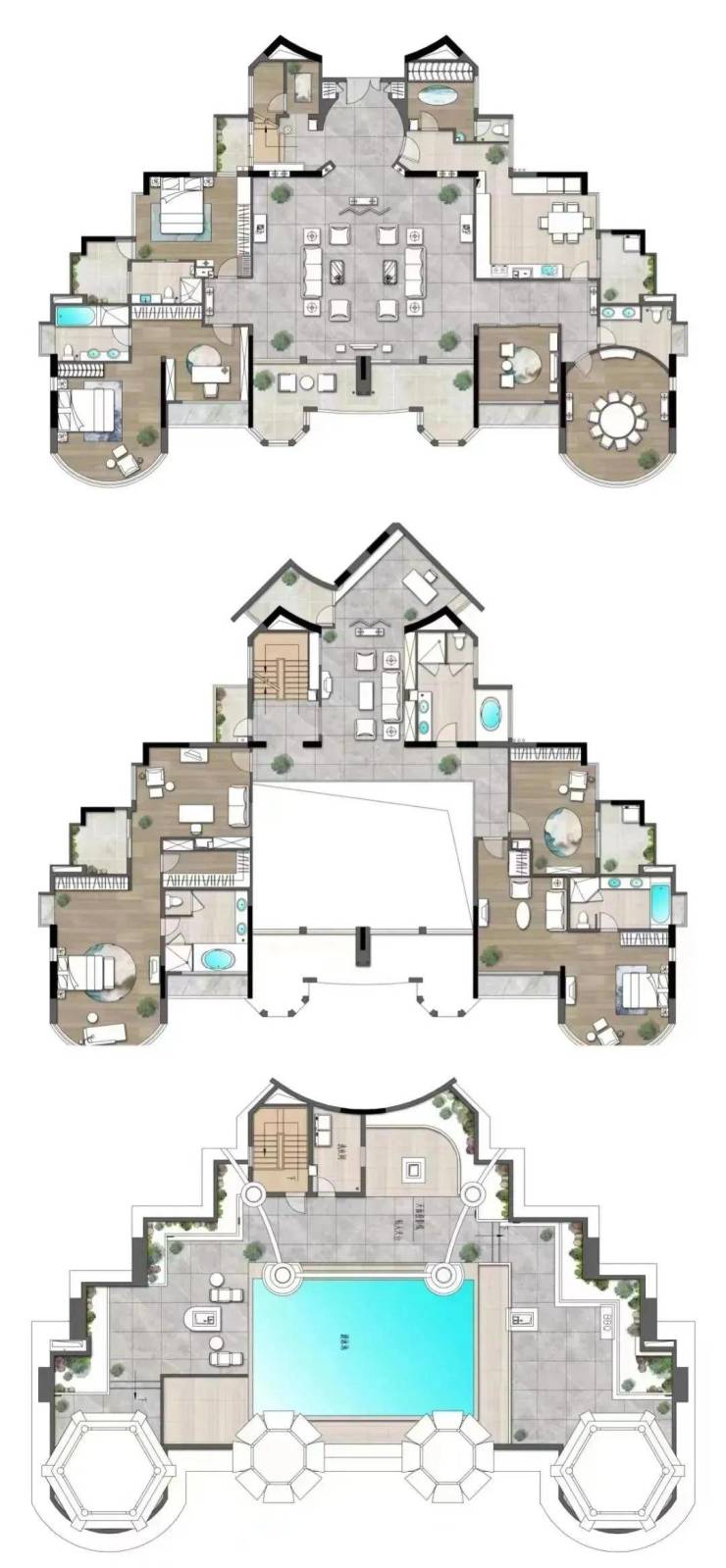再细看,约458平、467平、564平顶复户型图参考如下,为双层结构,且赠送多一层露天泳池花园,相当于有3层使用空间。