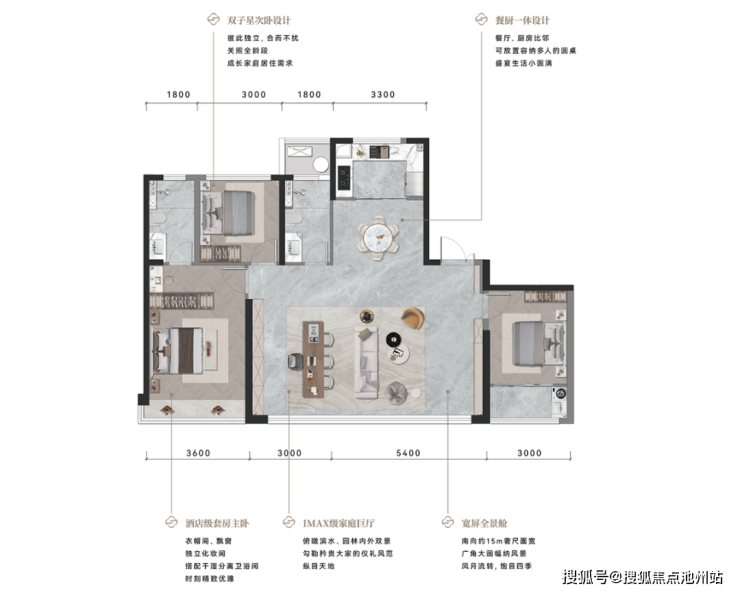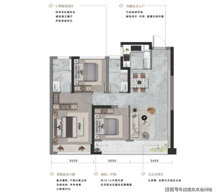 建面约106㎡边套臻品,得房率堪比市面上约120㎡户型,真正实现“越级”空间体验。更难能可贵的是——同面积段大多为中间套,而它是纯边套,北侧无连廊,舒适度直接拉满。南向三开间约11.1米奢阔面宽、餐客厨无缝衔接、行政套房主卧,让阳光、互动与私密在此从容兼得。