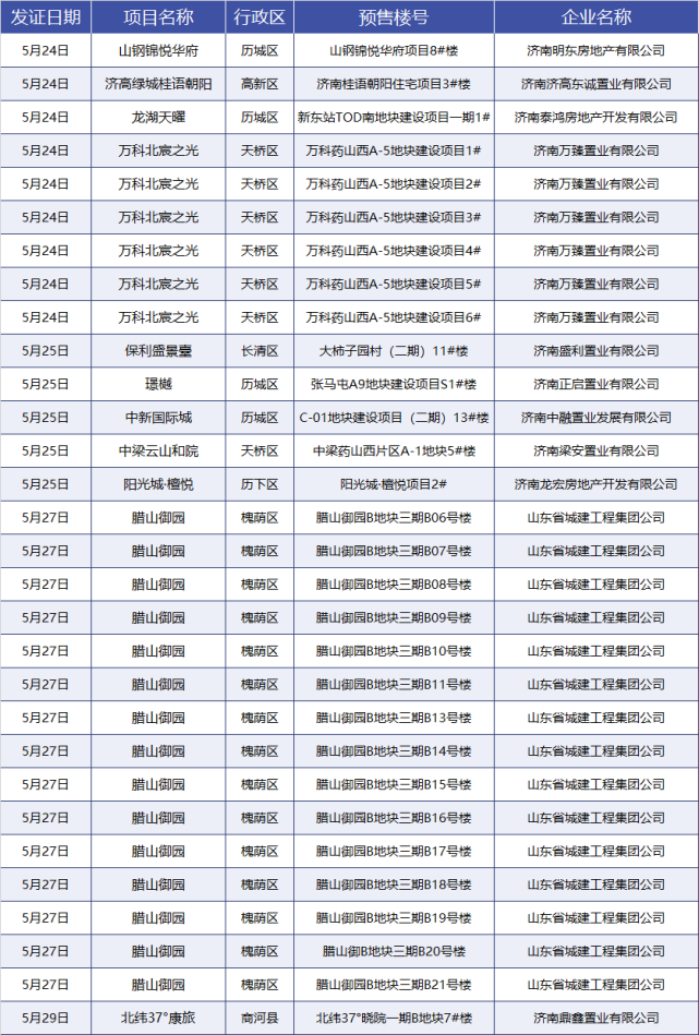 本周取证项目主要集中在天桥区、槐荫区,万科北宸之光(取证6栋洋房,约220套)、腊山御园(取证15栋别墅,约47套)两项目集中取证;阳光城·檀悦项目首次取证2#楼小高72套,预计6月即将首开。