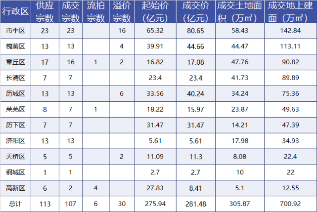 5月24日,济南迎来排名前列次集中土拍,共计成交各类用地107宗,流拍6宗,溢价30宗。