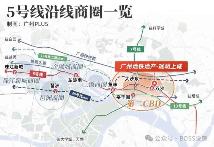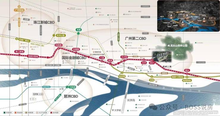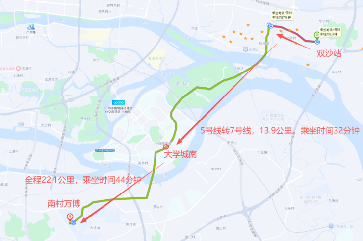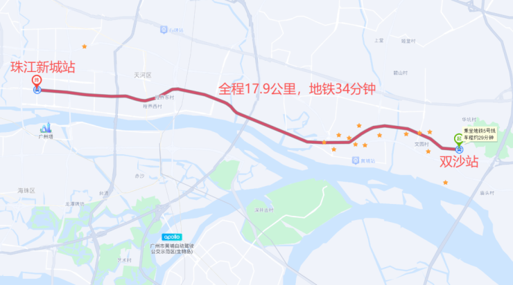 地铁:项目为地铁 5 号线双沙站上盖,可一线直达珠江新城、金融城等核心区域,且邻近地铁 13 号线、25 号线(规划中),沿线可换乘多条线路,去往珠江新城约34分钟,琶洲约34分钟,大学城南32分钟,万博约44分钟