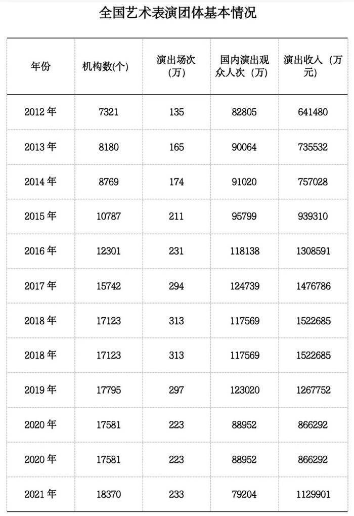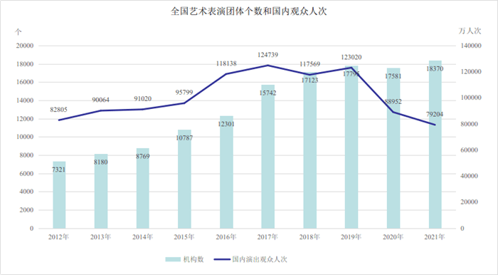 十年来,全国艺术表演团体机构数和国内演出观众人次稳步增长。 数据显示,2021年,全国艺术表演团体达到18370个,比2012年增加11049家。