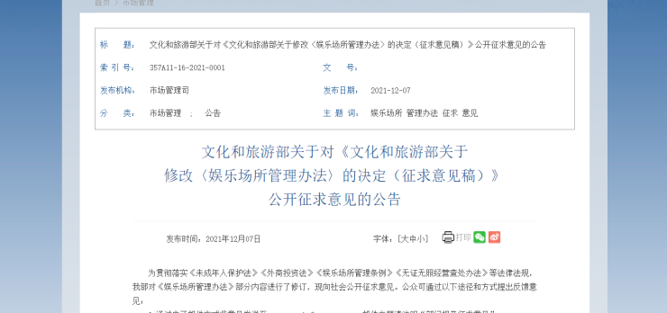 12月8日,文化和旅游部发布消息称,为贯彻落实《未成年人保护法》《外商投资法》《娱乐场所管理条例》《无证无照经营查处办法》等法律法规,文化和旅游部对《娱乐场所管理办法》部分内容进行了修订,现向社会公开征求意见。