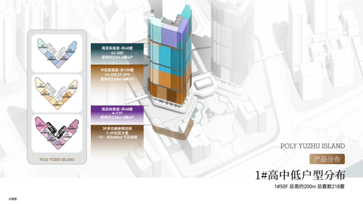 住宅4层起,户型分布,分成低区、中区、高区。 中区是6梯5户设计,户型为210㎡、220㎡、280㎡、340㎡、350㎡。 高区是6梯4户设计,户型是285㎡、330㎡、400㎡。