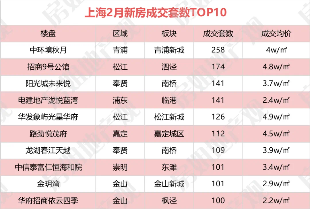 下面是2021年2月上海各区一手房成交明细,房姐按照成交均价排序,方便大家定位到符合自己购房预算的价位段。