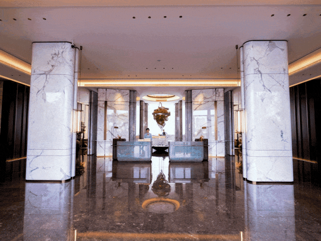 双服务前台,同样以意大利进口的亚马逊蓝大理石打造;光是这,就已足足有三种天然奢石,足见项目的舍得。