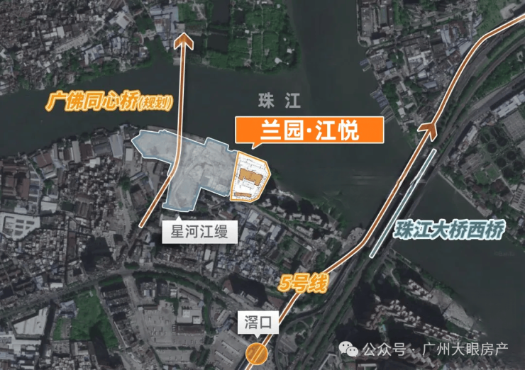 项目位置就在5号线滘口站附近,距离地铁口约1公里,项目一墙之隔,就是星河江缦及二手豪宅珠江鹅潭湾,不管是地铁出行还是自驾出行都十分便利。旁边规划的广佛同心桥,可直通佛山地区;白鹅潭大道未来也可通往广船和医药港等地。