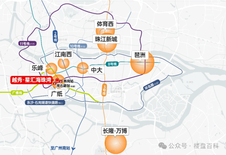 地铁——广佛线燕岗站大约500米,从这里出发向西直达佛山,向东接驳地铁2、3号线,能快速抵达珠江新城、白云新城等;地铁11号线(在建)南石路站,就在家楼下,广州首条环城地铁,开通后直接串联5大中心区,一路经过广州东、琶洲等商务区以及广州火车站、广州东站两大交通枢纽,无论是上班通勤还是商务出差,一条地铁就能解决出行问题。