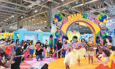 除了北京故宫,其他一些首次参展的主题展区同样富有特色,风靡现场。例如“缤Fun葡语系”展区设置了土风舞表演、歌手吉他弹唱、咖啡品尝、木雕制品展售等环节,独特的异域风情吸引了不少观众参观,也凸显了澳门的中葡交流平台作用。