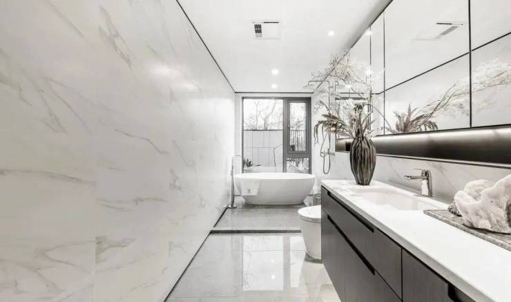 同时,我们巧妙运用“竖条分段式设计”。如厨房移门,衣帽间玻璃门的长虹玻璃,纹理飞流倾泄,灵动且富层次;电视背景墙的极简竖条形制,卫生间的三段式处理,尽显立体艺术感。包括一些特别考验工艺难度的收口、线条等,都从细微处流露巧思。