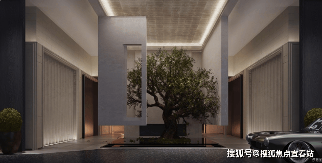 约13m挑空的下沉庭院,以约4.5m高玻璃幕墙引景入地,形成“主入口-艺术环廊-视觉水景”的空间序列。地下一层光庭为车库引入自然光线,实现功能与美学的统一。