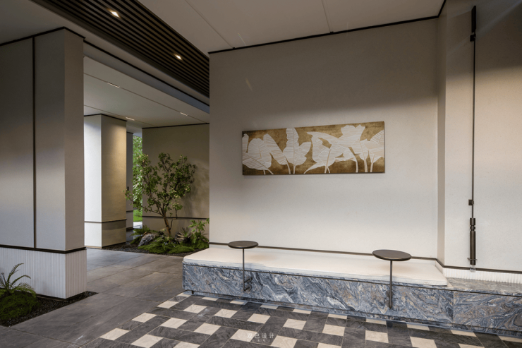 5栋的「云栖·西派艺术馆」 雕塑长廊与立体庭院串联,巧妙地陈设“风”字的金属雕塑、形似层峰叠峦的艺术壁画、融入白云山沉淀的绿宝石。