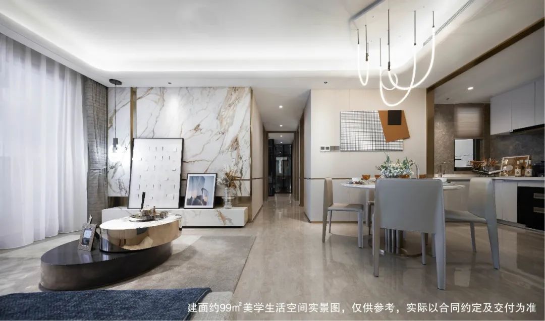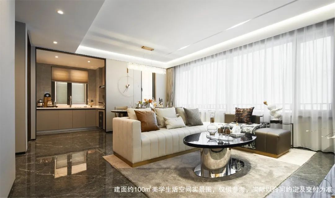 更精心设计一个餐客厅相连的阔绰边厅,气派感十足,侧面饰以大面积的晶莹玻璃,从公园绿意到城市盛景,开阔的视野一览无余,天光云彩辉映下,人生胜意感油然而生。
