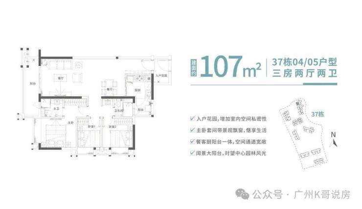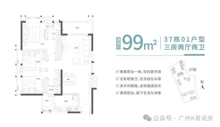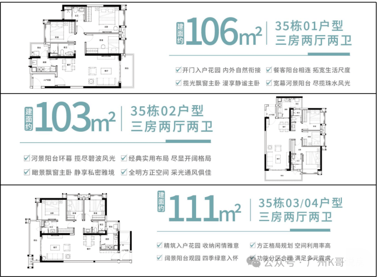 此次广地花园·观灏,面积段80-107悦景三房,多面采景,三面望水,通透采光,充分利用户型的每一寸肌理,以有限的生活空间焕发更多生活灵感,打造全方位人性化居所。