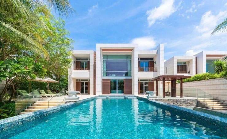 4室4厅9卫;地上二层,地下一层;单层净挑高4m;入户8.2m双挑高;带有电梯预留井;超大阳光平台;超大前入户花园,自带园林水系,双车位停车入户;私家泳池花园配30㎡独立泳池,活动平台,烧烤区;步行2分钟即可到达沙滩海边。