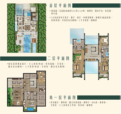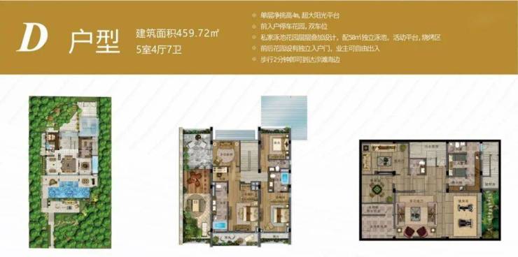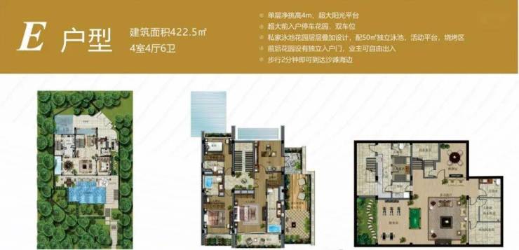 4室4厅6卫;地上二层,地下一层;单层净挑高4m;超大阳光平台;超大前入户停车花园,双车位;私家泳池花园层层叠加设计,配50㎡独立泳池,活动平台;烧烤区;前后花园设有独立入户门,业主可自由出入;步行2分钟即可到达沙滩海边。