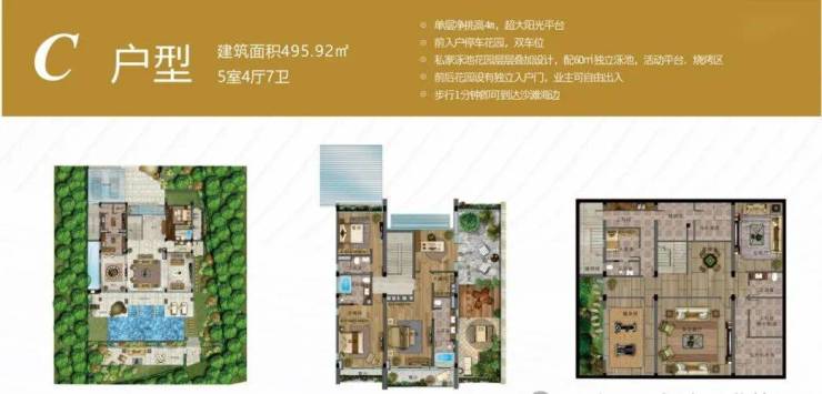 5室4厅7卫;地上二层,地下一层;单层净挑高4m;超大阳光平台;超大前入户停车花园,双车位;私家泳池花园层层叠加设计,配58㎡独立泳池,活动平台;烧烤区;前后花园设有独立入户门,业主可自由出入;步行2分钟即可到达沙滩海边。