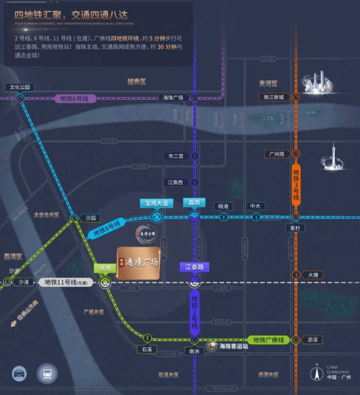 中冶·逸璟广场位踞宝岗大道与江燕路交界处,比邻半亿鼎豪住区,四地铁环绕,一步尽享海珠四大商圈醇熟生活配套。