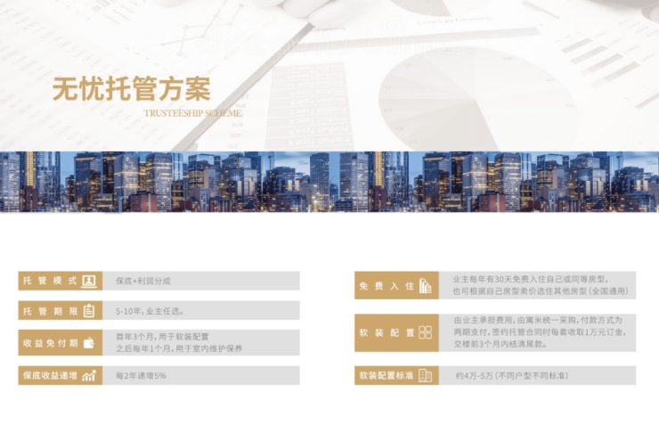 项目入驻寓米酒店管理公司,国际大牌实力有保障,由专业团队运营全方位托管,收益稳健增长,保底收益即可达140元㎡,投资回报率高达5.61%。