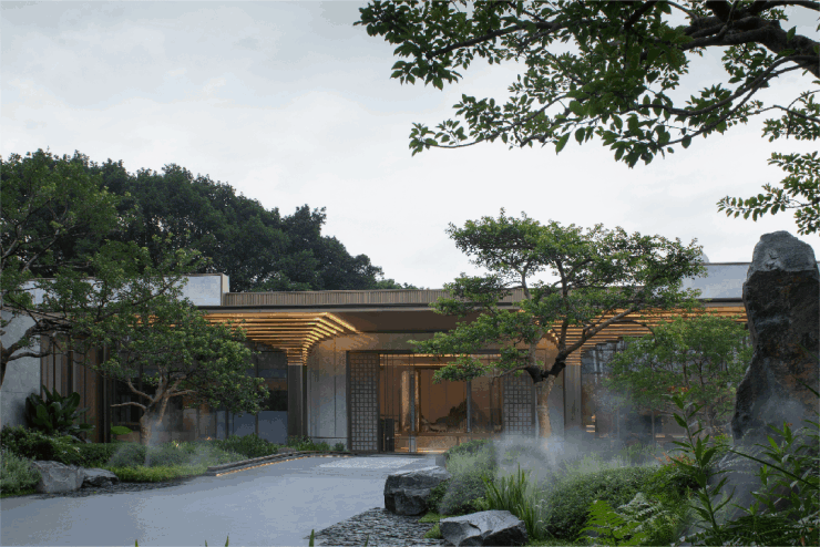 园林采撷《梁园飞雪图》画中意境及神韵,引入曲水飞虹、万倾涵碧、松间、观澜、林隐等景观组团,再现“枯山水”东方禅意画卷,缔造具有东方韵味的新中式之美。