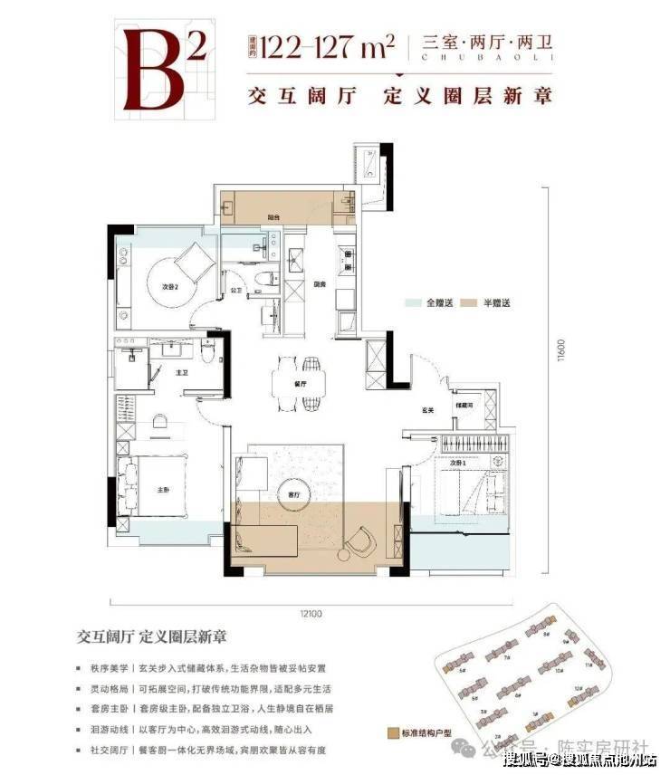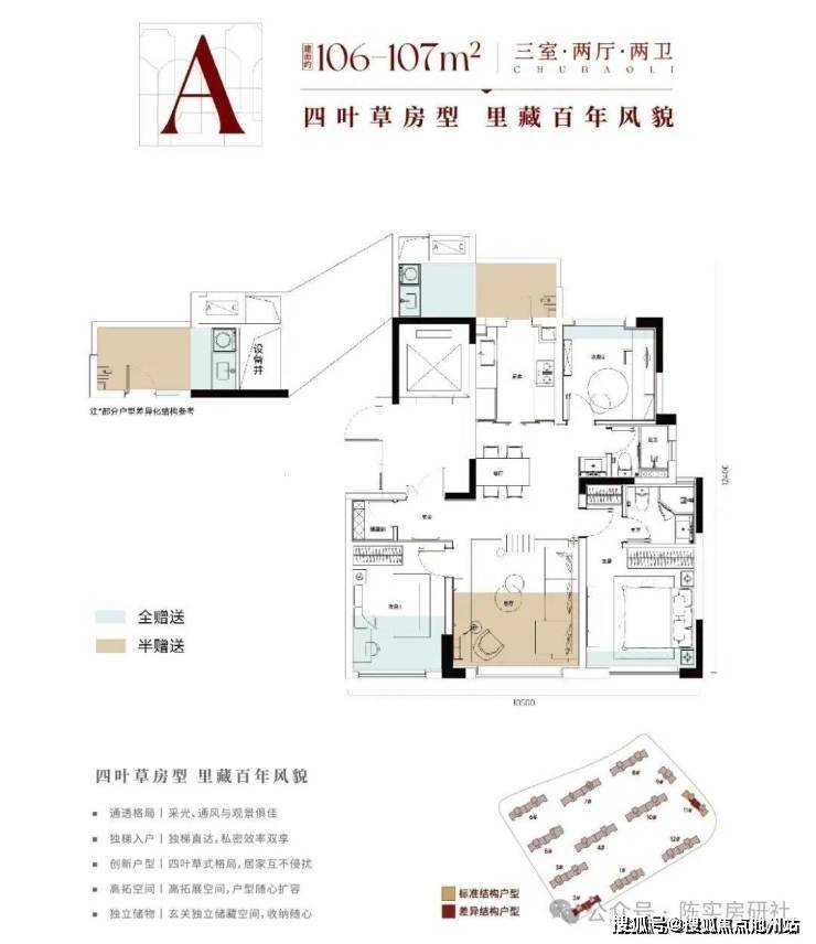该户型位于2 号楼及 11 号楼,有独立的入户电梯厅,三开间朝南,西南面开间约10.5米,三个卧室均带全尺寸飘窗,100m²左右的功能性三房。