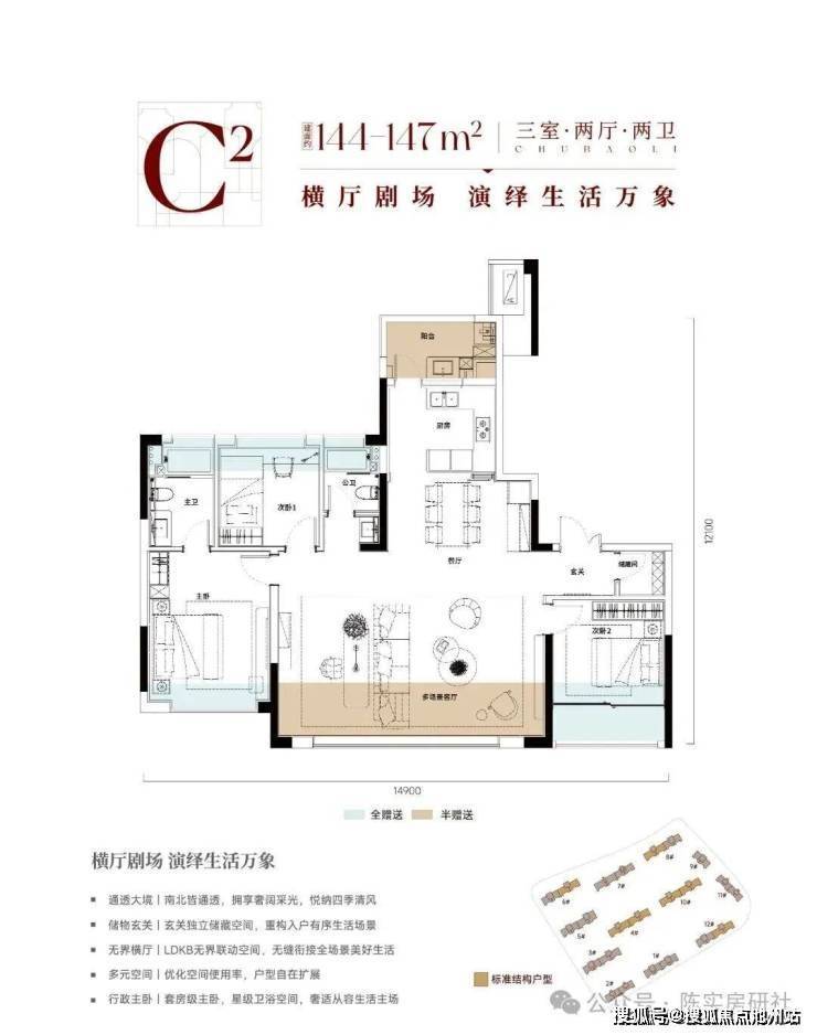 该户型位于4、6、8、10号楼及 12 号楼,有独立的入户电梯厅,四开间朝南,入户门口也有一个小型储物空间,且南北双阳台布局,南向面宽达到14.9米。