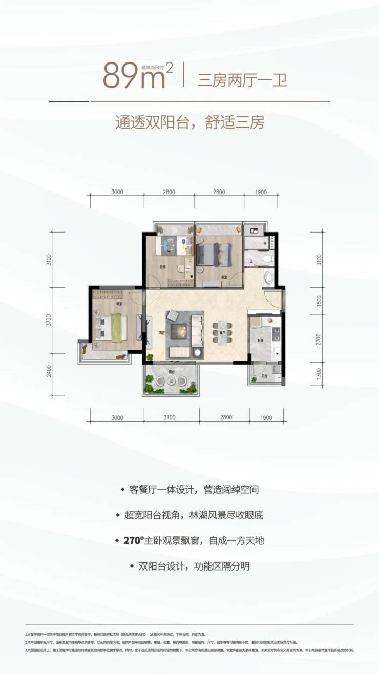 约89㎡三房两厅一卫:通透双阳台,三口之家的舒适三房