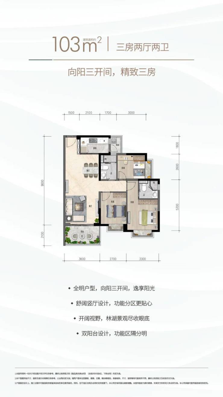 约103㎡三房两厅两卫:向阳三开间,瞰湖精致三房