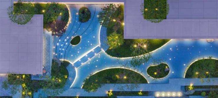 三重归家仪式。第一重,泛星大堂。第二重,聆星客厅。第三重,伴星入户花园。社区核心景观——星光溪涧。灵感取自于西湖边的九溪十八涧,把江南的山、江南的石、江南的小桥和流水都搬进星曜社区。