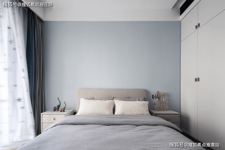 次卧儿童房则采用了低饱和度色彩搭配,浅蓝色背景墙搭配浅灰色床品,充满童趣的星星纱帘搭配灰蓝色窗帘,通顶柜体设计实现完美的储物空间,干净简洁。