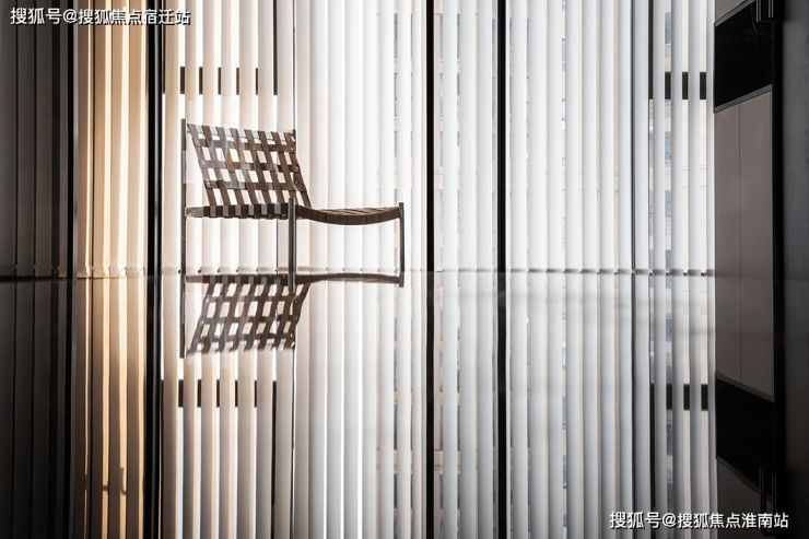 垂直百叶窗将透过大落地窗照进家中的光线均匀切开,营造出光影的效果,既保证了充足的光线又有效保证了隐私性。