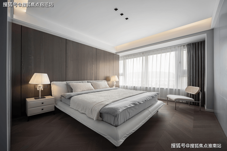 主卧的鱼骨拼木地板与护墙板颜色均选用了深棕色,搭配不同明度的灰色床品与窗帘,摒弃了浮华的装饰,整个主卧空间呈现沉稳有层次感的效果。